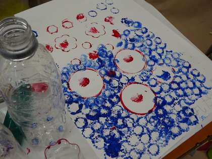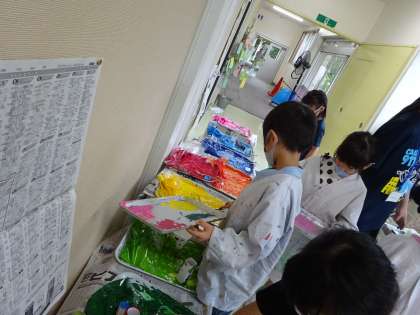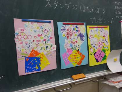 図工で、空き容器や段ボール、スポンジなど、身近な素材の丸や四角、三角の形を、学校で用意した絵の具につけて模様をつくりました。出来上がった作品は、スタンプの花束になります。押してできる模様や絵の具のいろいろな綺麗な色を楽しむ1年生でした。