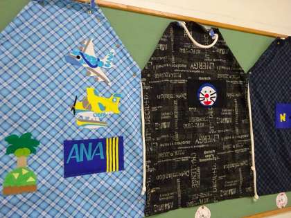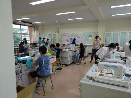 家庭科でエプロン作りをしています。ミシン組とポケットやアップリケ作成組の2つのグループに分かれて、家庭科室と教室で取り組んでいます。何人かは完成しました。ミシンでの保護者の方のお手伝いありがとうございます。