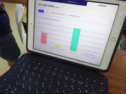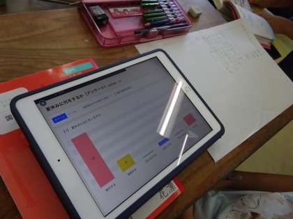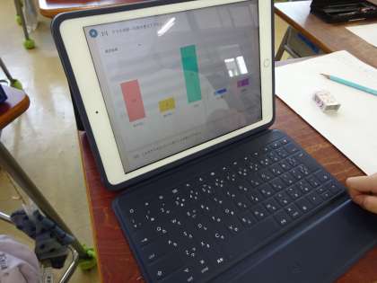 新聞の特徴を確かめ、どのような新聞を作るかグループで話ってテーマを決めました。取材をし、割り付けについて話し合って記事を書いていきます。取材に一つとして、アンケート調査をしました。ロイロノートのアンケート機能を使ってみました。