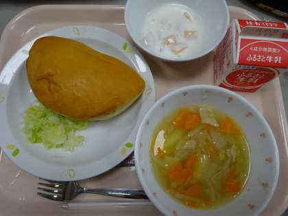 本日の献立 セルフィッシュサンド 牛乳 豆入り野菜スープ ピーチヨーグルト