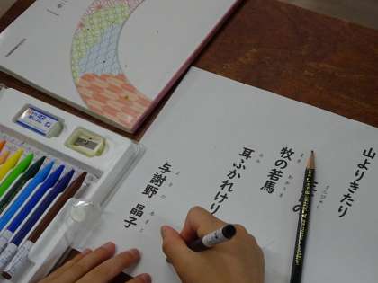 短歌の学習をしました。リズムよく何度も読んだり、短歌の世界のイメージを広げて挿絵を描いたりしました。みんな姿勢よく一生懸命に取り組んでいました。