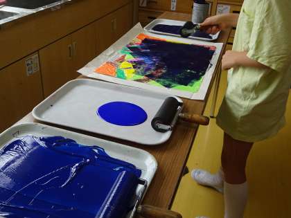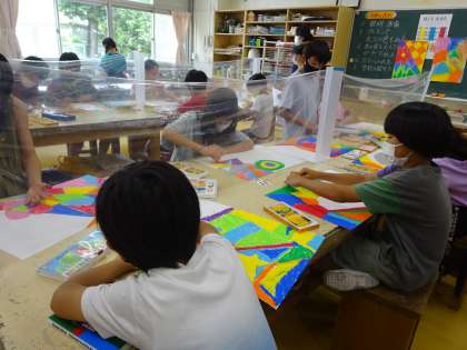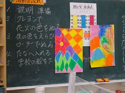 81周年の駒繋小学校。新しい一歩をお祝いする「花火」をイメージして色を塗っていきました。続きは2学期に。展覧会の装飾としてどのような花火が上がるのかをお楽しみに。