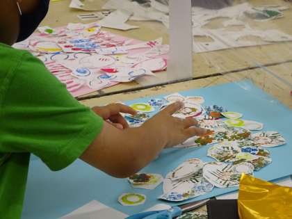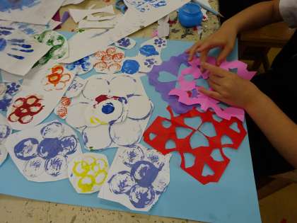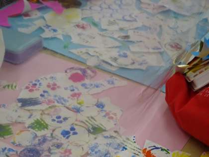 先週の図工の続きをしました。スタンプや色に関心をもっていろいろなスタンプの模様を画用紙いっぱいにつくった1年生。今日は、それを切り取って花束にしていきました。イメージを膨らませながらすてきな花束が出来上がりました。展覧会に飾られるのが楽しみです。