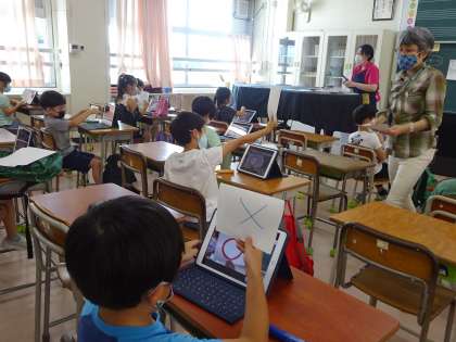 本日1年、3年、6年生の「Zoom学活inサマー」を行いました。写真は1年生の様子です。学童に行っている子は音楽室で参加しました。久しぶりに担任の先生やお友達の姿にとても嬉しそうな子どもたちでした。「会いたくなっちゃった。」という声が聞かれました。保護者の皆様のご協力ありがとうございます。