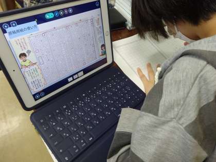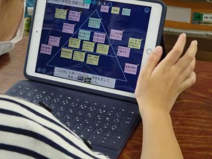 3年生以上は、iPadが貸与された時期も早かったので、日常的にタブレットを活用して学習を進めています。写真は、5,6年生のロイロノート活用の様子です。