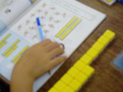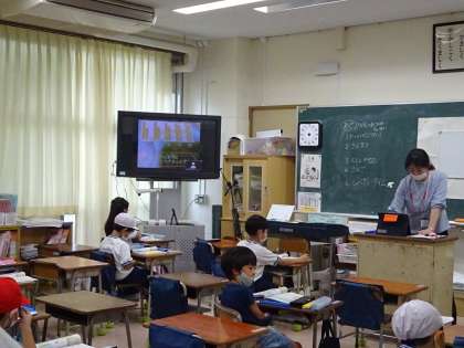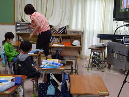 1年生の算数の様子です。「10よりおおきいかず」の学習をしました。1組担任が授業をし、2組、3組の担任が各子どものノートを見ていきました。学習サポートの支援員も入って支援をしています。Aグループの子どもたちは、家からオンライン配信を見ながら学習をしました。途中、声が聞こえないときは、教室でも何も話していないので安心してください。