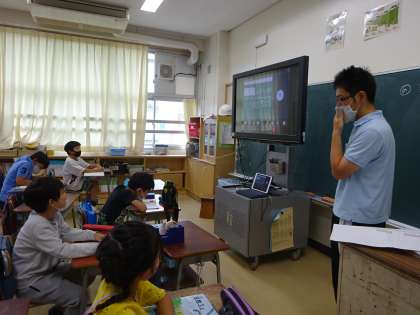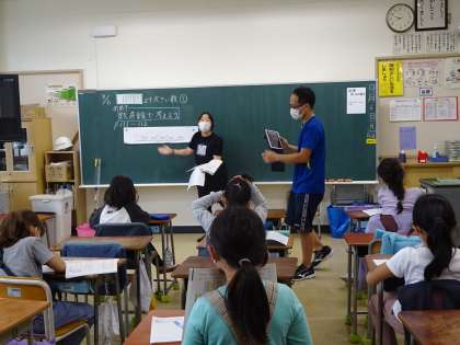 3年生算数の様子です。算数少人数担当教員が授業を進め、その様子をオンライン配信しています。1組、2組の担任は、T2となり、個々の子どもに対応しています。