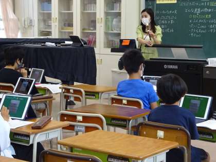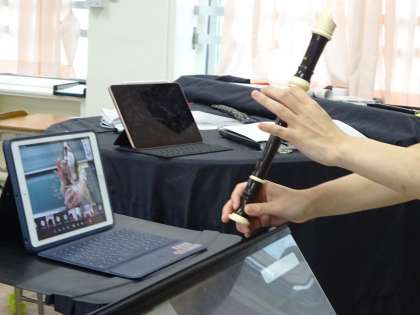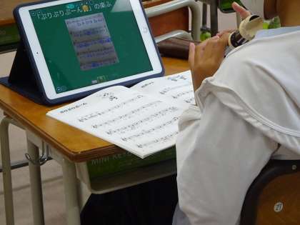 4年生の音楽の様子です。感染症予防をしながら取り組んでいます。対面授業のBグループは、教科書やロイロノートに送られてきている楽譜を見ながらリコーダーの指使いを学びました。Teamsを活用したオンライン配信のAグループは、授業の様子を見て、自宅で実際に吹いてみました。