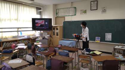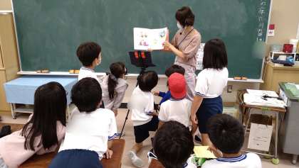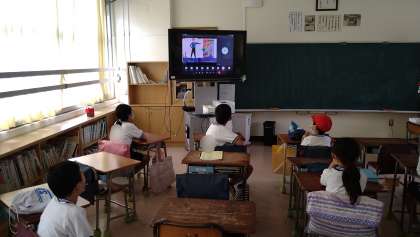 教室では本の近くに集まってきいています。もう1人の担任は、画面共有でじっくり絵を見せていました。教室に児童がいませんよね?自分の声だけで、じっくりときかせているようです。