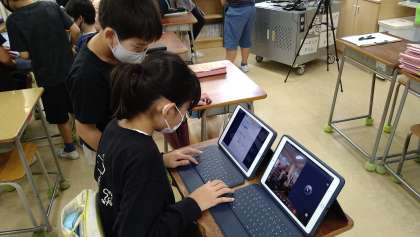 この写真は、オンラインチームの児童とオンラインミーティングをしているところです。2台のiPadを開き使いこなしています。