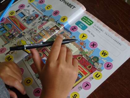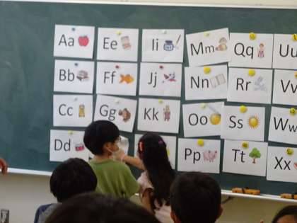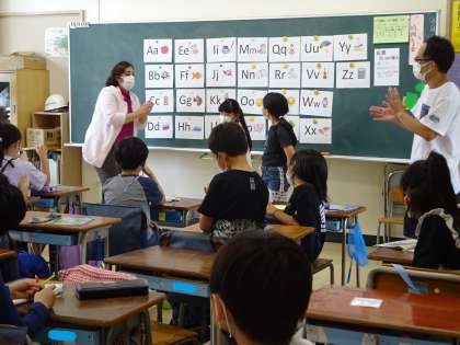 3年生の外国語活動では、アルファベットの大文字と小文字を学びました。ALTの発音を聞いて、言われたアルファベットのカードをタッチするゲームをしました。