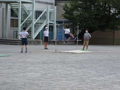 6年生の体育で「走り高跳び」の学習が始まりました。今日は、場の設定の仕方を覚え、学習の進め方を確認しながら「走り高跳び」に取り組みました。
