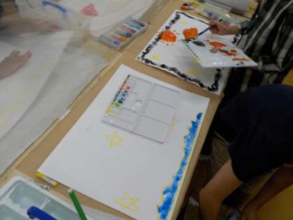絵の具と水の量を工夫して、にじみの世界を用いた平面作品をかいています。