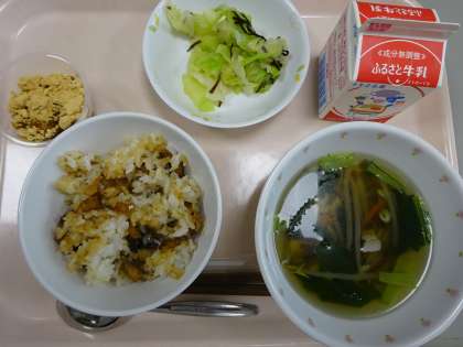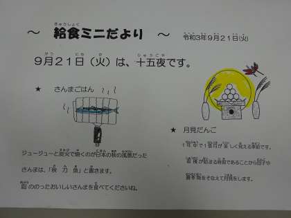 さんまごはん 牛乳 沢煮椀 キャベツの塩昆布かけ 月見だんご