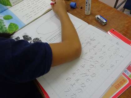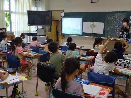 1年生の国語で「やくそく」のお話を読んでいます。だれが何を言ったりしたりしたか気を付けて読んでいます。あおむしや木になったつもりで、想像をふくらませて発表し、吹き出しにあおむしの気持ちを書いています。