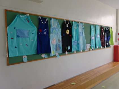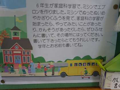 6年生は家庭科でエプロン作りをしています。ミシンで縫ったり、ポケットにアップリケを付けたり。でき上がった人の作品は掲示されています。