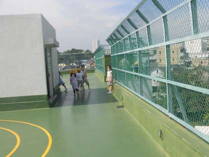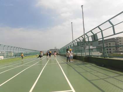 おにごっこや かけっこ遊び、ケンパーなど。元気いっぱいに遊びました。屋上から見える校庭や、遠くの景色にも、興味津々です。