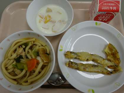 本日の献立 けんちんうどん 牛乳 天ぷら(ししゃも・かぼちゃ)