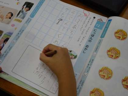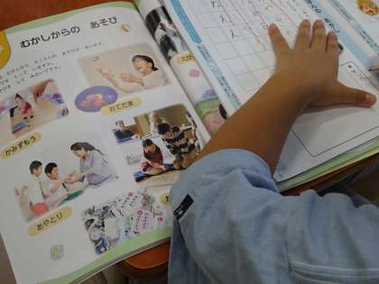 1年生の道徳です。「にっぽんのおかし」という教材文を読んで、日本に昔から伝わるお菓子や遊び等を伝え合い、あらためて日本のよさを感じました。