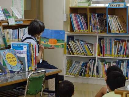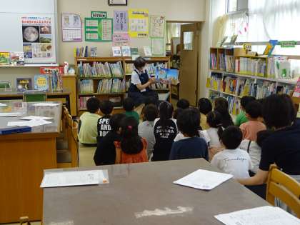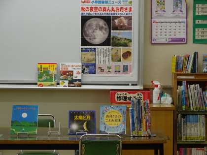 学校には、「学校図書館司書」さんが勤務されています。本の整備や図書室の季節やテーマに応じた掲示や本の準備、学年で必要な図書の準備などしていただいています。授業の初めに読み聞かせをしていただくこともあります。写真は、「月」をテーマとしたお話を1年生が聴いているところです。