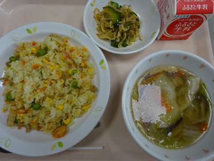 本日の献立 チャーハン 牛乳 もやしのコチュジャンかけ ワンタンスープ