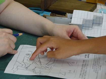 5年生は図工でビー玉迷路を作ります。工作用紙でビー玉が転がる道や仕掛けをつくります。まず、工作用紙で基本の道づくりを学びました。そして、ビー玉が楽しく転がるアイディアを考えました。自分が取り入れたいアイディアを考えてアイディアスケッチに描き、そのアイディアを図工専科教員に説明してから、「道づくり」に入りました。