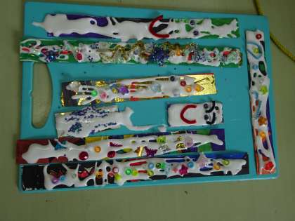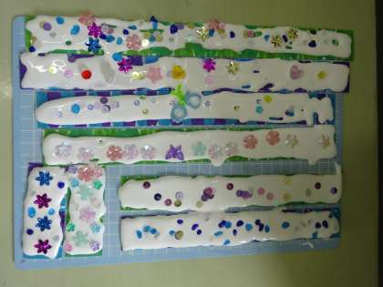 以前にも掲載しているので、写真が何かはお分かりかと思います。「こまつなぎ水族館」の枠になる予定。パッと見同じように見えますが、子どもたちは、この作品にも自分の思いを込めています。「楽しくできたこと」や「工夫したところ」「よくできたところ」などを発表し合いました。