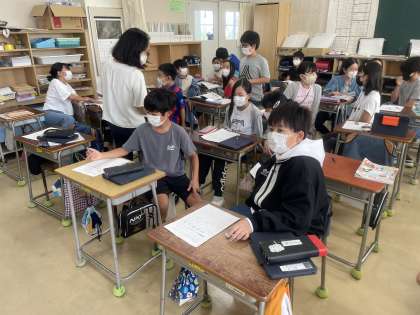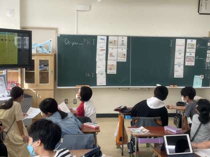 外国語の学習では、家の手伝いや一日の生活についてたずねあう学習を進めています。友達に「Do you〜?」を用いて、家の手伝いをしているか質問したり、「What time 〜?」を用いて、起きる時間や寝る時間をたずね合ったりしました。英語を通して、友達の意外な一面に気がつくことができ、盛り上がる場面が見られました。
