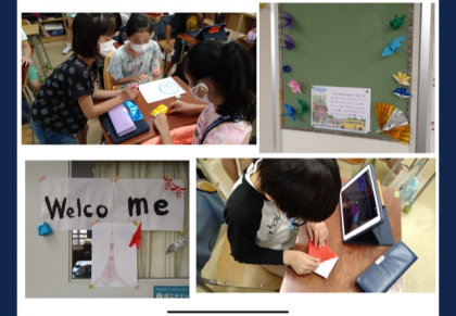 そして、日本を感じていただけるよう、習字や折り紙で飾り付けをしました。ICT活用は、YouTube視聴です。折り方動画を見て、すごく難しい折り方に挑戦していました!富士山、東京タワー、折り鶴、豪華折り鶴、紅葉、赤とんぼ、などなど。