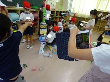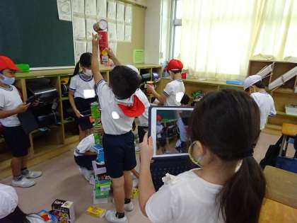 家からたくさんの空き箱を持ってきた1年生。算数の「かたちあそび」の学習で、まずはその箱を使って高く積み上げる遊びをしました。高く積み上げた様子は、iPadで記録しました。