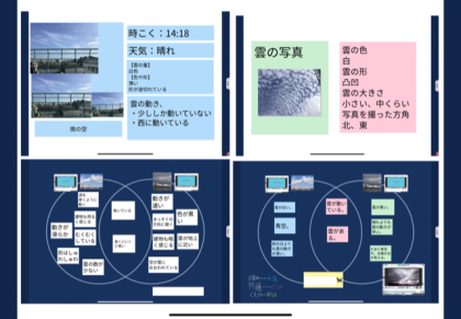 雲の写真を撮って特徴を見つけたり、晴れと雨の空を比べてベン図にまとめたりしました。屋上では東西南北を分担して「せーの」で同時刻の空を撮影しました。同じ位置で、日にちや時刻を変えて撮影を続けます!