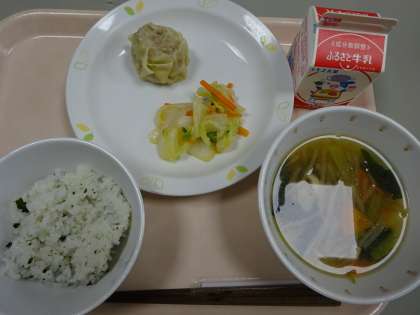本日の献立 わかめごはん 牛乳 ジャンボしゅうまい 辣白菜 中華スープ