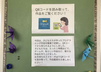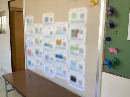 5年生教室前の掲示にはたくさんのQRコードが貼られています。このQRコードにカメラをかざし読み取ると、子どもたちが「ビスケット」で作ったプログラミングの作品を鑑賞することができます。他の学年の子たちが観て楽しんでもらったり、興味をもって作るきっかけになったりすることを期待しています。保護者の方々も、学校公開などでいらした際に、ぜひお子さんの作品を鑑賞してみてください。
