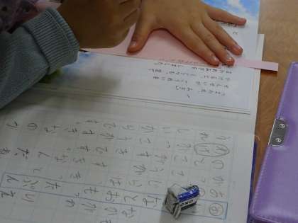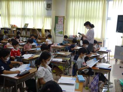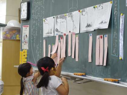 1年生の下巻の教科書の始まりは「くじらぐも」です。今日、このお話の初めての学習をしました。先生の範読を聞く子どもたちは、「ええ!」「すごいや」等と反応し、すぐにお話の世界に入っていきました。今日は、「いいな。」「すきだな。」と思ったところを探し、ノートに「わけ」と共に書いた後に、短冊にも書いて黒板に貼りました。友達と同じ、違うが視覚的にも分かりました。