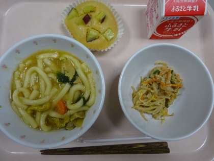 本日の献立 カレーうどん 牛乳 もやしのごまあえ 黒砂糖入蒸しパン