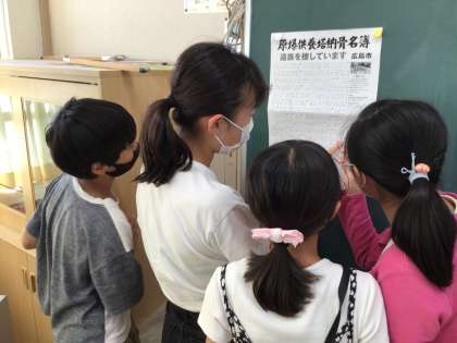 教室に、広島市のホームページに載っていた「原爆供養塔納骨名簿」を印刷し掲示しています。物語の中では、「綾」が「アヤ」に出会うきっかけとなったキーアイテムです。
