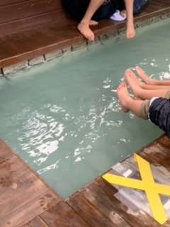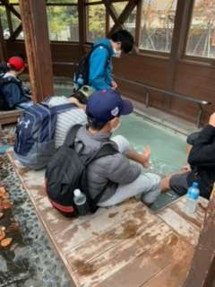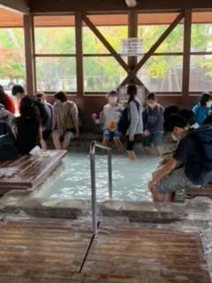湯元温泉「あんよの湯」で足湯体験をしました。熱さが3つに分かれていて、一番熱いエリアに足を入れた子どもたちからは、思わず「あっ、熱い!」の声が上がりました。ちょうど良い温度のエリアでは、「気持ちい〜い!」でした。