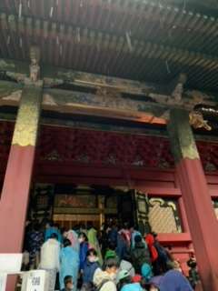 鳴龍の見学をしました。天井に描かれた龍の真下で拍子木を打つと、キーンと龍が鳴くように響きます。他の部分の下で拍子木を打っても響きません。その音に聞き入る子どもたちでした。