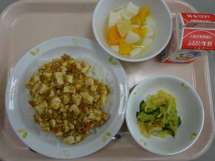 本日の献立 麻婆豆腐 牛乳 中華サラダ 杏仁豆腐