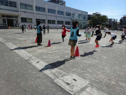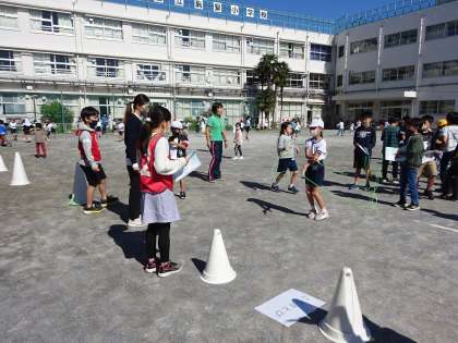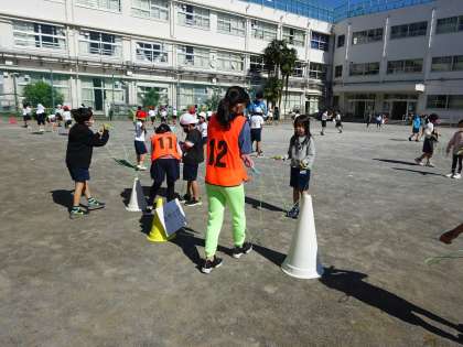今日の中休みは、3年生以下の子どもたちがなわとびに取り組む「エンジョイなわとび」の日でした。検定を受けるエリア、跳び方を教えてもらうエリア、練習するエリアに分かれて取り組みました。今日も「なわとび指導員、上級指導員」が検定や教える役を行いました。良い天気の中、みんな一生懸命に取り組んでいました。上の写真は検定中、下の写真は「こうさとび」や「あやとび」を教えているところです。