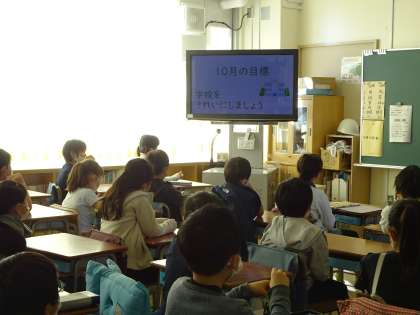 看護当番の先生から今週の目標「すみずみまでそうじをしよう」の話がありました。掃除の時のポイントの話や自分の頑張りたいことを考えさせたりしました。
