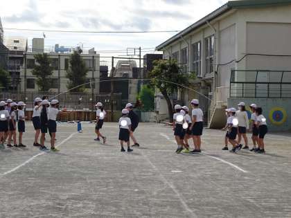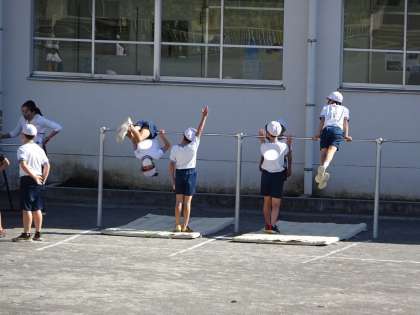 4年生の体育様子です。上の写真では、鉄棒で基本的な回転技の練習をしています。下の写真では、からだほぐしも兼ねて、12月のなわとびコンクールの大縄跳びの練習をしているところです。