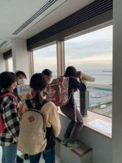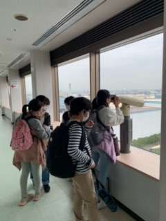 シアターで川崎港の働きを学んだ後、10階の展望台から川崎港の様子を見ました。遠くまでよく見えて、港や周りの様子がよくわかりました。雲行きは怪しかったのですか、雨は降らずに社会科見学の全行程は順調に終了しました。