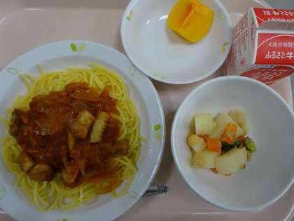 本日の献立 スパゲッティ地中海ソース 牛乳 ビーンズサラダ 柿