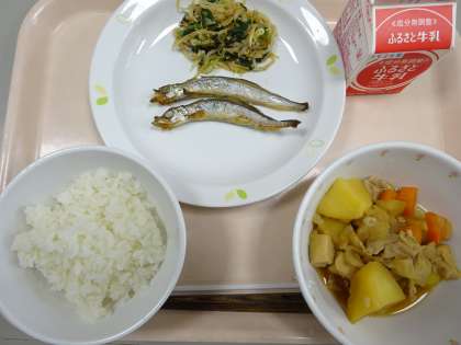 本日の献立 ごはん 肉じゃがうま煮 こまつなの乾物あえ 焼きししゃも