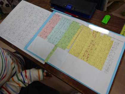見たこと、聞こえてきたこと、感じたこと、触った感じ、お気に入りポイントなどを、たくさん見つけた後に、見つけたこと一つにつき、一つずつ短冊に書きました。その短冊を並び替えて、文章の構成を考えました。