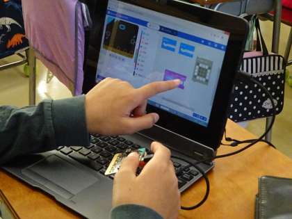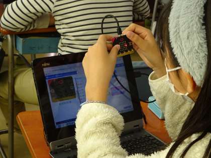 昨年度PTAで購入していただいた「マイクロビット」を使いました。マイクロビットは、イギリスのBBCが主体となって作った教育向けのマイコンボードです。プログラムして、簡単な図や文字などを表すことができます。
