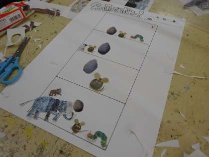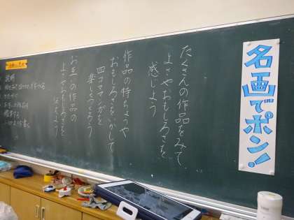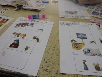 5年生の図工です。教科書を見て、世界のいろいろな作品の特徴を考えました。作品の特徴を生かしたり、自分の思いに合った作品を選んだりして、物語を考えました。そして、作品の写真を切って貼ったり、言葉などを書き加えたりして4コマ漫画に再構築しました。