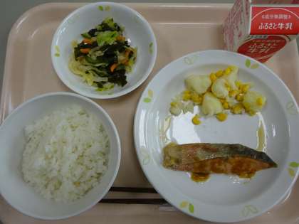 本日の献立 ごはん 牛乳 魚のステーキソース コーンポテト わかめサラダ