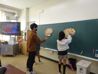 交流鑑賞の後には、ペアの人への感想を書いて、クラスごとに「つながりパレット」を作成しました。ペアで鑑賞して関係をつくった後も、つながりは続きます。